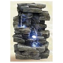 Alpine Tabletop Waterfall Fountain w/ Light has the look of natural stone. Made of durable resin. The streams of water flow to create a relaxing and meditative atmosphere. Alpine Tabletop Waterfall Fountain w/ Light includes super bright white LED energy-saving light.